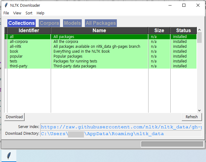 그러면 깃털 모양과 함께 NLTK downloader창이 뜬다